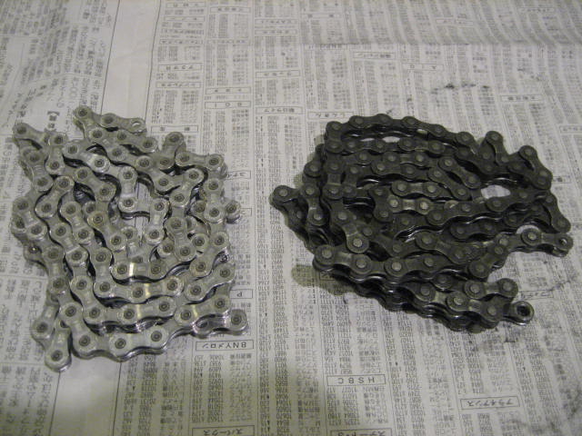 一応右の旧いチェーンも簡単に脱脂したのだが、なんともみすぼらしい。まるで墨でも被ったみたいだ。